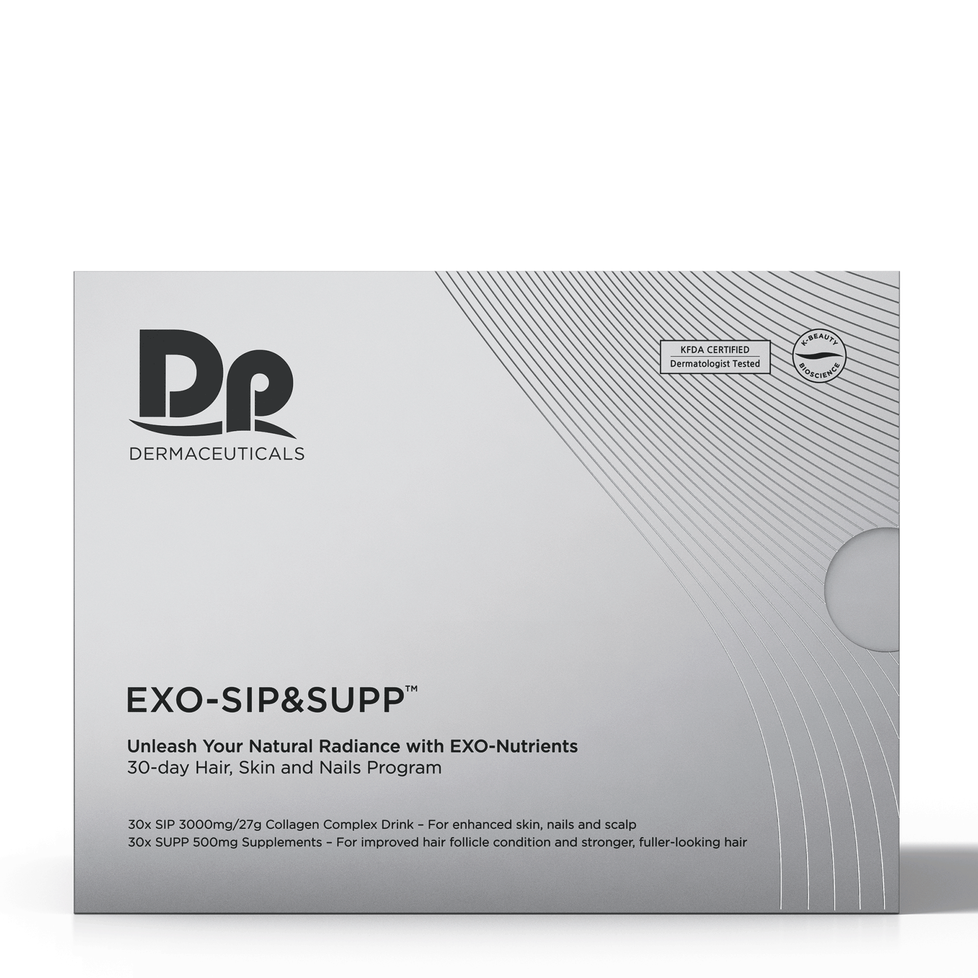 EXO-GROW Sip & Supp ist die optimale EXO-Nährstoffkombination und bietet ein tägliches Programm zur Verjüngung der Haut, Stärkung der Nägel und Förderung strahlend schöner Haare. Die Box enthält 30 Drinks – ausreichend für einen Monat voller Schönheitspflege.